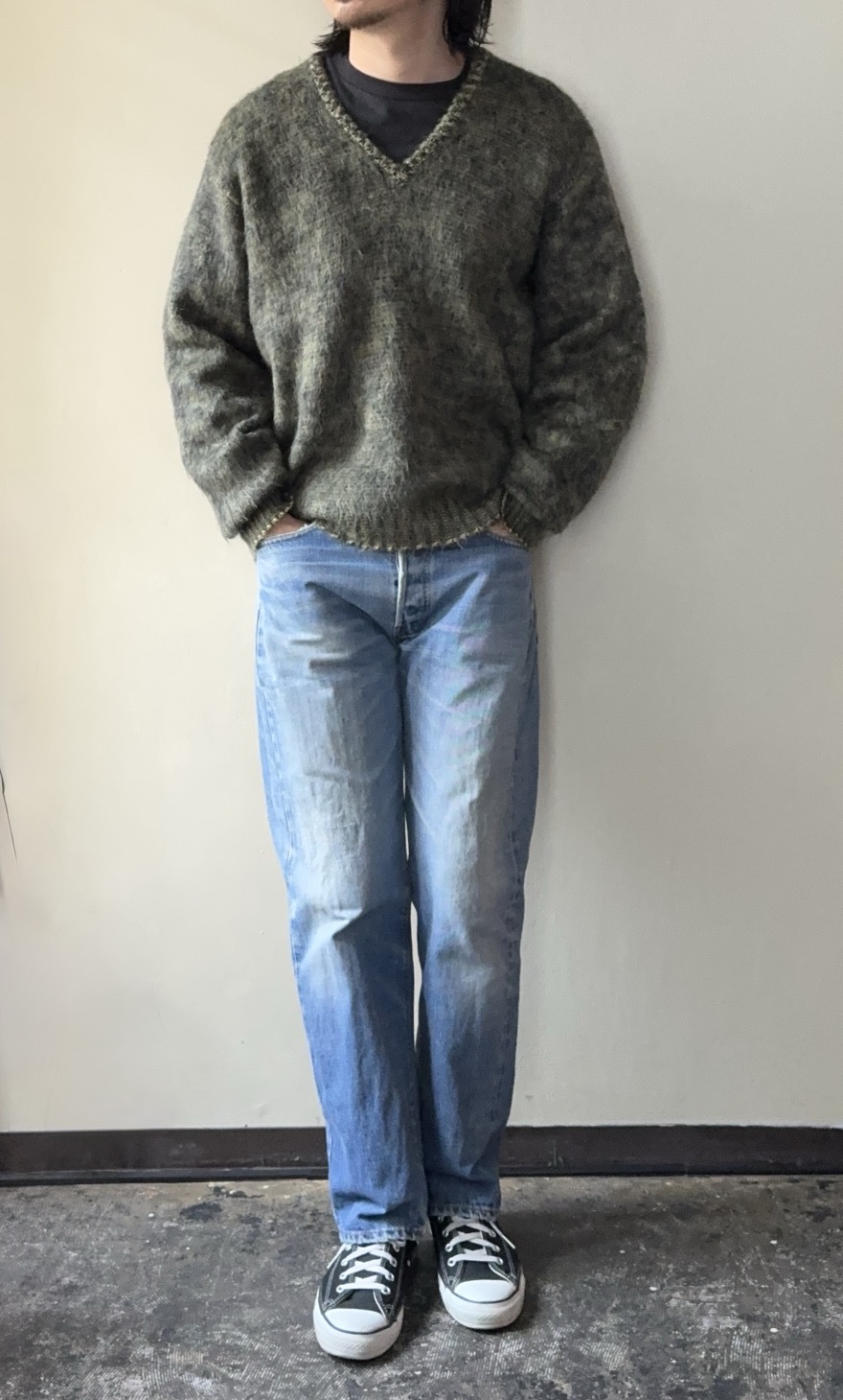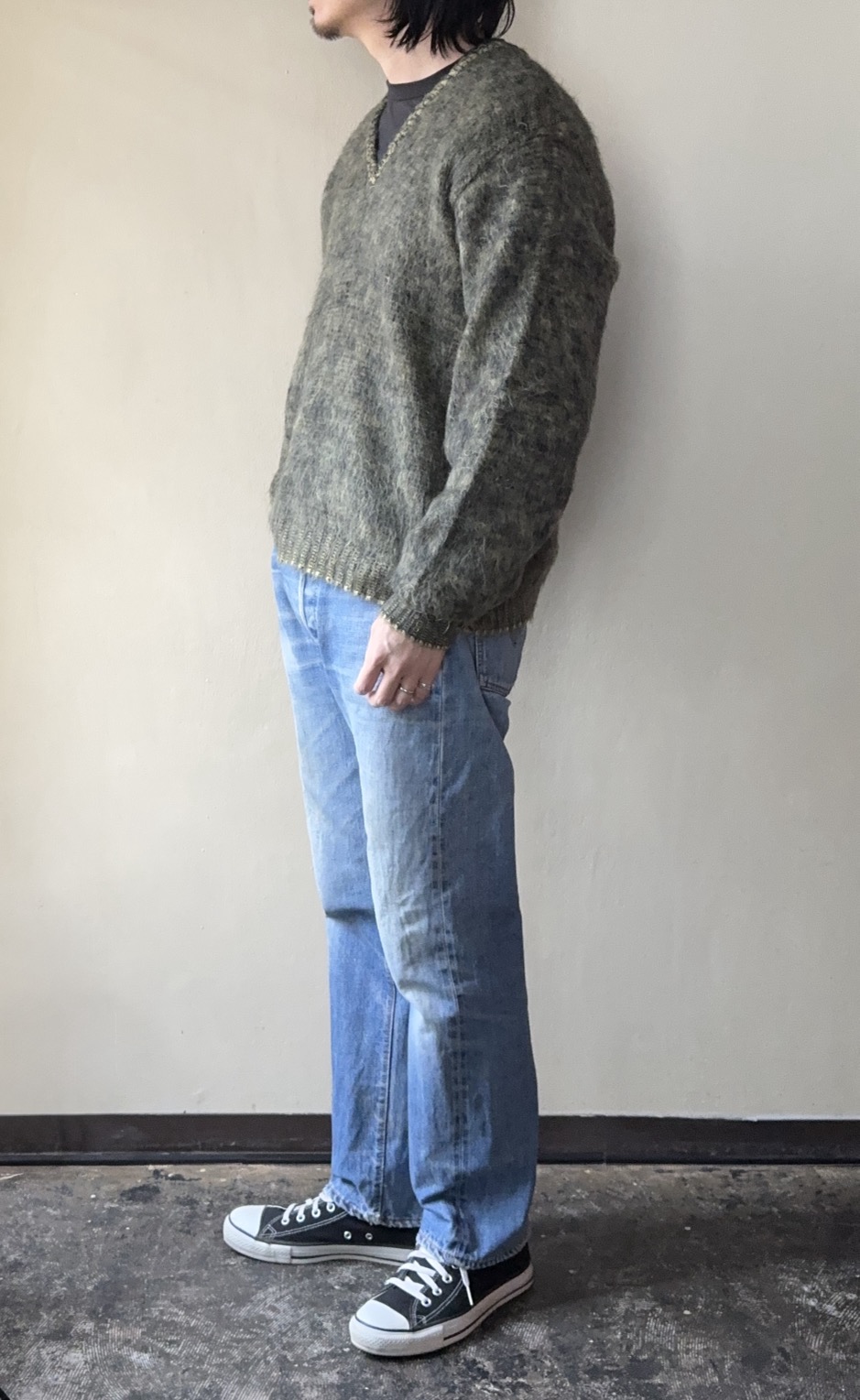濃いデニムも良いですが、このくらいの雰囲気のデニムで革靴やニットなどのアイテムと合わせていただくとバランスがよく個人的に好みです。