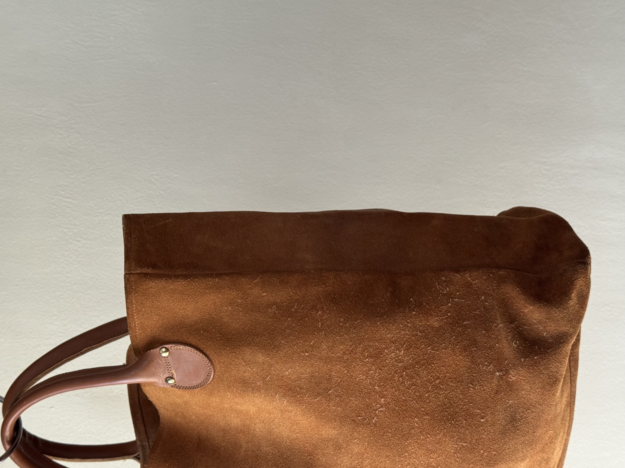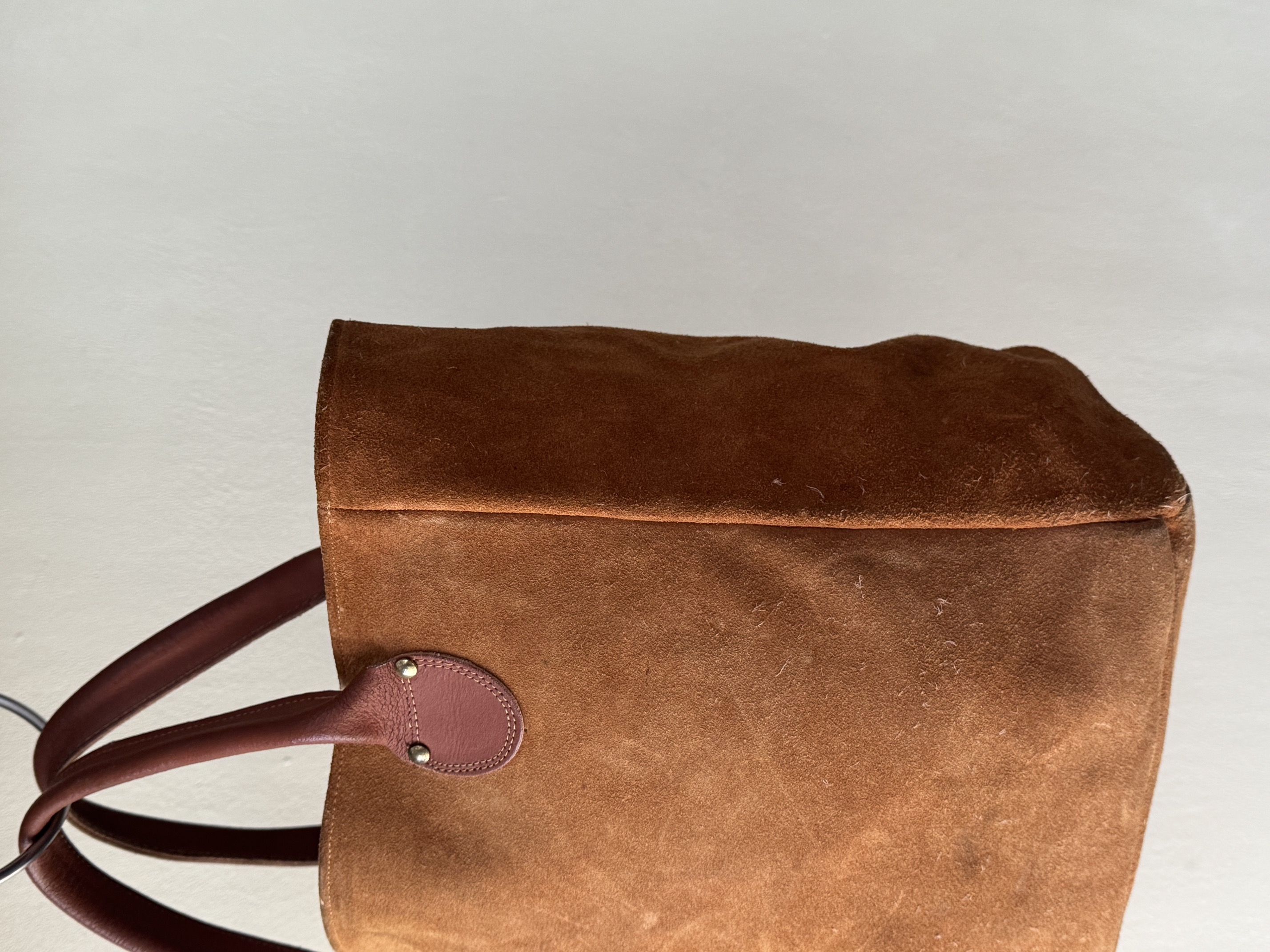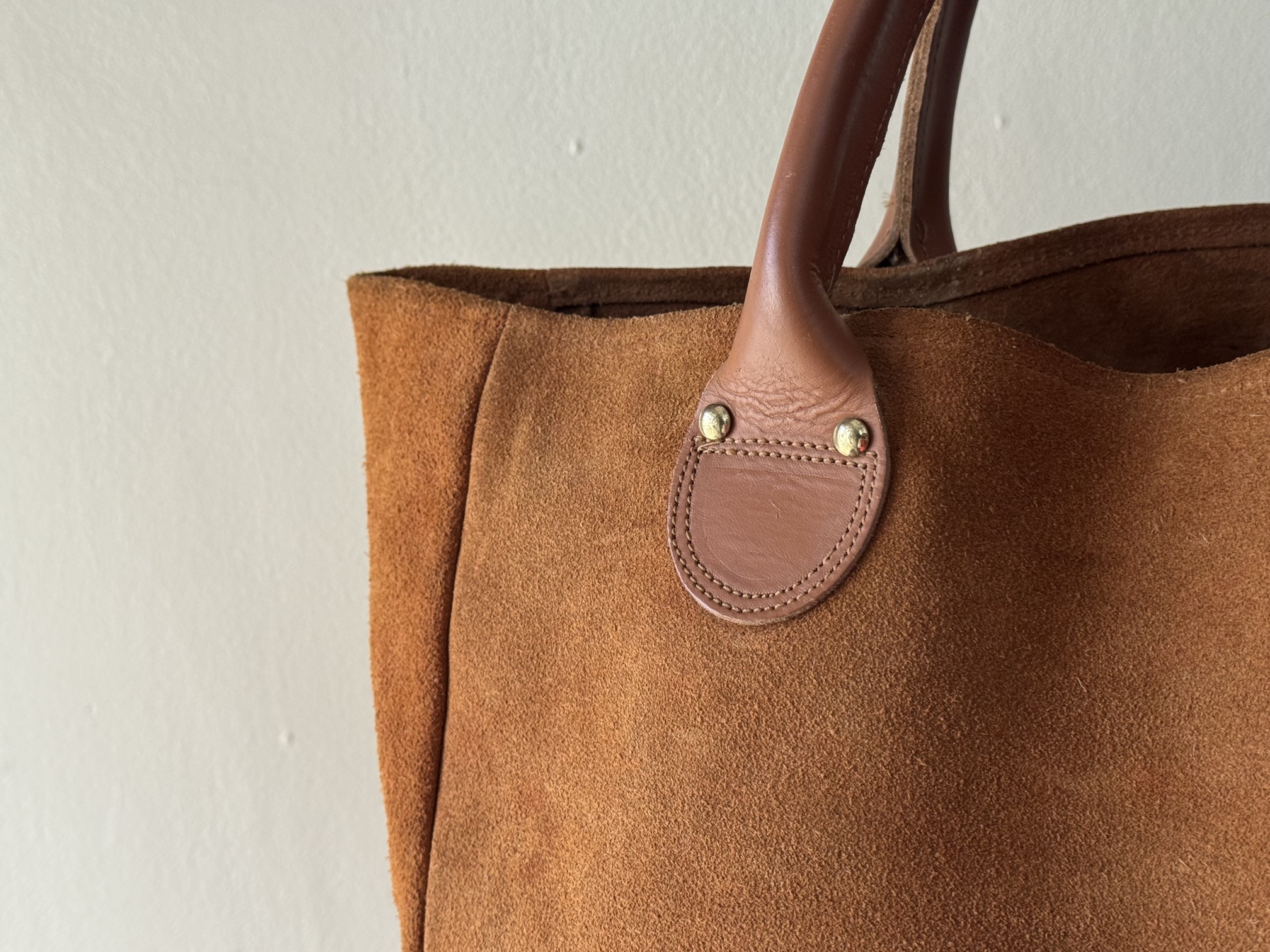 ハンドルの持ち手の長さのバランスがちょうど良く、スエードレザーなのも抜け感があり、雰囲気があります。。。