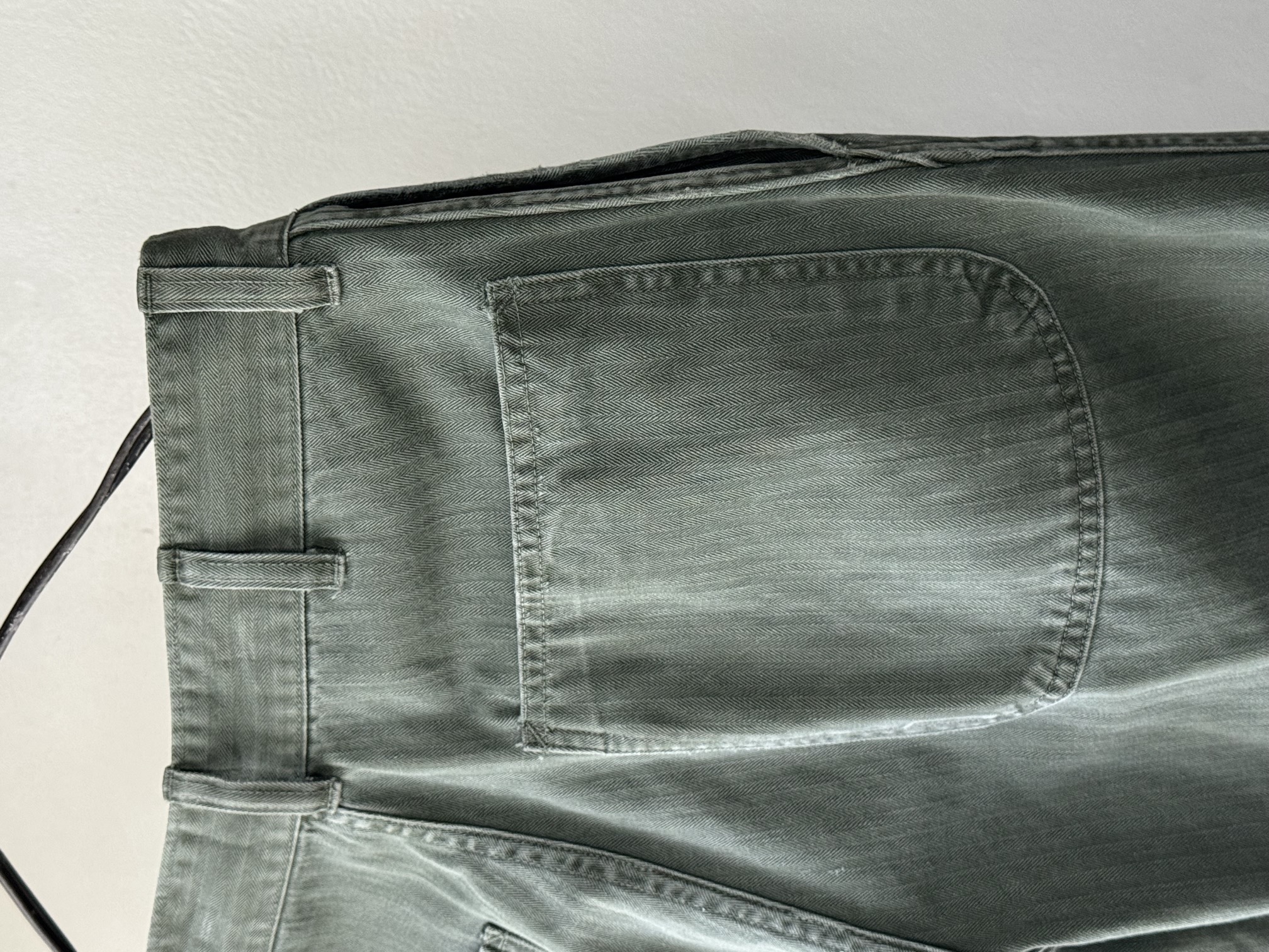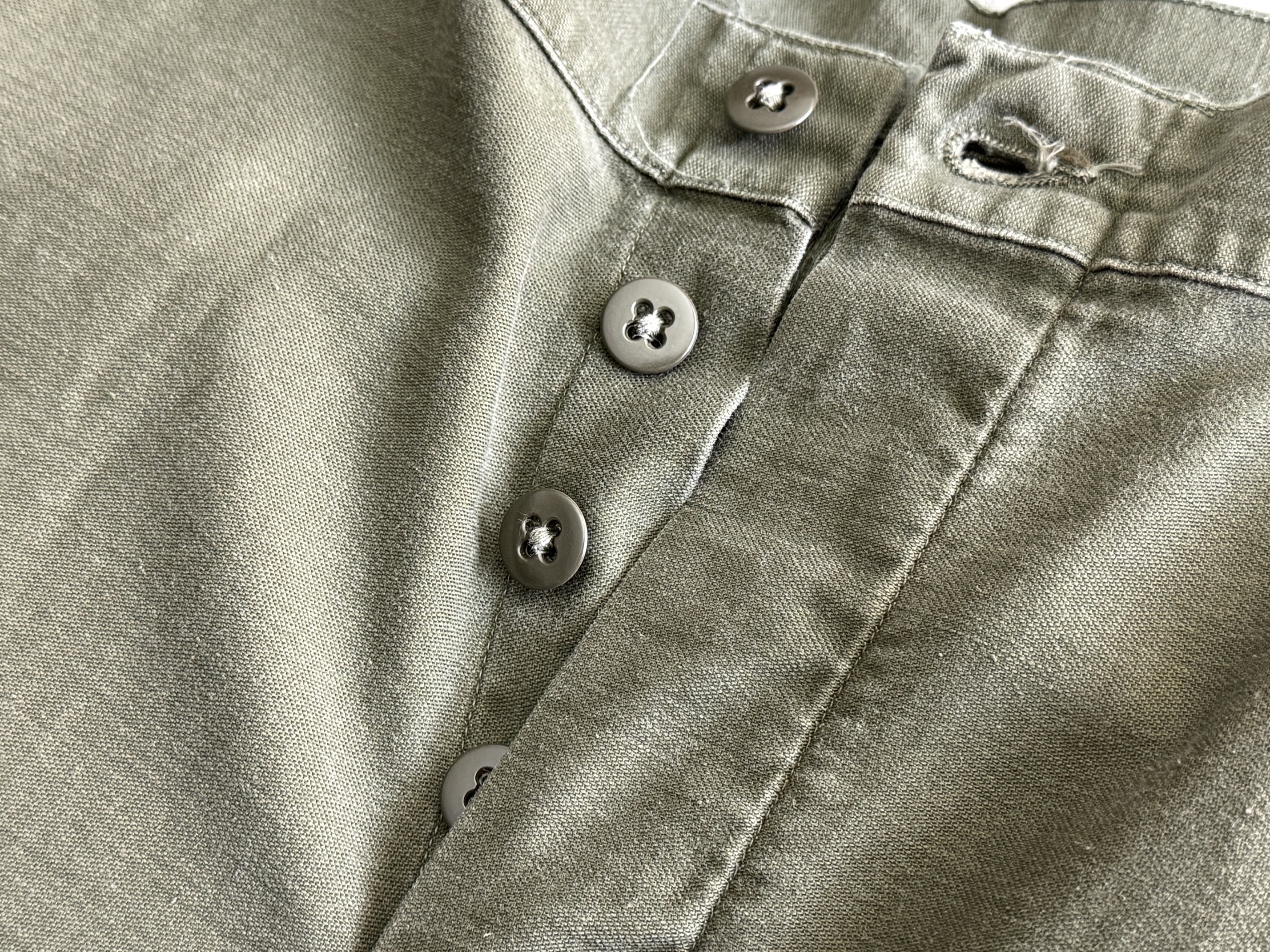 特徴的なフロントのポケットとUSMCのメタルのドーナツボタンに程よくフェードした色味が素晴らしい雰囲気です